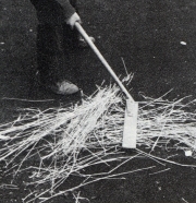Gwenn et Pierre tiennent le vrai fléau à battre le blé qui servait dans le vieux temps, C'est Pierre qui l'a apporté à l'école. Ils nous expliquent que pour construire un fléau, on prend deux morceaux de bois (un grand rond et un plat) et deux bouts de cuir ou de caoutchouc. Les deux bouts de cuir servent à attacher les deux bouts de bois par deux boucles l'une dans l'autre. |