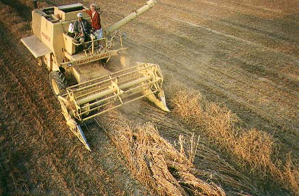Autrefois, on battait sur l'aire avec des fléaux. On utilisait le van pour séparer le grain de la balle (enveloppes des grains) et des débris de paille. Maintenant, tous ces travaux : faucher, battre, vanner, trier pour obtenir les grains de blé se font en même temps avec une moissonneuse-batteuse. |