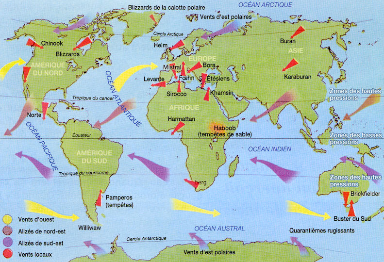 L’harmattan est un vent froid chargé de poussières qui souffle de l’est ou du nord-est sur le Sahara. Il assèche les voies respiratoires chez l’homme. Il reste très sec car il ne traverse aucune étendue d’eau. Le blizzard est un vent du grand Nord, glacial, violent et accompagné de neige qui souffle sur le Canada en hiver et au printemps. Le sirocco se forme dans le désert du Sahara. Il souffle vers le sud de l’Europe. Il est d’abord chaud et sec, puis il se charge d’humidité en traversant la mer Méditerranée. En Antarctique, le katabatique est un vent glacial des montagnes qui souffle vers les côtes. Les vents qui viennent des régions chaudes et des déserts font monter la température de l’air. Le föhn est un exemple de vent chaud qui souffle en montagne. Il se forme quand l’air perd de son humidité en s’élevant le long d’un versant au vent. En Amérique du Nord, le föhn est connu sous le nom de chinook. Il souffle sur les versants est des montagnes Rocheuses. Il fait fondre la neige et peut faire monter la température de 20 °C en moins d’une heure. En France, les vents les plus connus sont le mistral et la tramontane. Le mistral est un vent violent, froid et sec qui descend la Vallée du Rhône. Il est dû à des dépressions localisées sur la Méditerranée. La tramontane est un vent froid qui souffle sur la région du Languedoc et du Roussillon. |