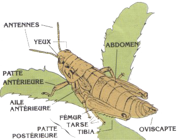 Comme les papillons, les scarabées, les abeilles, les mouches, les libellules... le criquet a six pattes et quatre ailes : c'est un insecte. Les pattes postérieures sont très allongées. Ce sont elles qui lui permettent d'effectuer de grands sauts. La