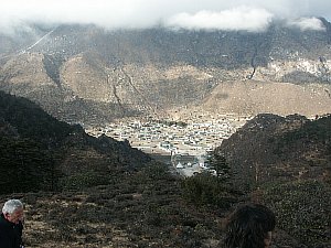 de repartir encore plus haut le 3 Novembre. Namche est la porte d'entrée du Khumbu et grand centre de commerce du pays sherpa. Une centaine de bâtiments s'étagent en demi-cercle sur le flanc de la montagne. Au-dessus du village, des champs dominent l'esplanade centrale abritant le gompa et le marché tibétain. On trouve de tout à Namche Bazar (les Sherpas disent Nauje) : gîtes, restaurants, maisons de thé, nourriture, vêtements, souvenirs touristiques, matériel de trekking, Yaks et cloches à yak, Carlsberg ou chang, Coca Cola, barres de chocolat Mars... et un cyber-café pour envoyer un courriel à nos enfants et petits enfants. |