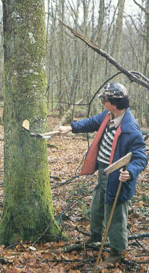 Clique sur le triangle lecture pour entendre le reportage. Arbres malades à droite au fond, à couper. * Délit : Arbres abattus sans marquage, donc sans autorisation. ** Séranon est une commune située au nord du département du Var, à la limite de celui des Alpes-Maritimes. *** Diamètre : un arbre dont le diamètre du tronc à 1,30 m de hauteur est compris, par exemple, entre 42,5 cm et 47,5 cm, est classé comme si son diamètre était de 45 cm. Marquage d'un arbre